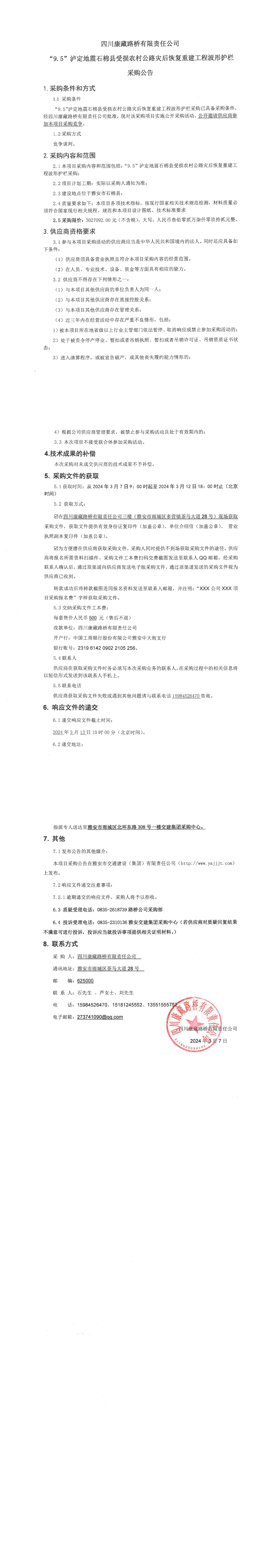 四川康藏路橋有限責(zé)任公司“9.5”瀘定地震石棉縣受損農(nóng)村公路災(zāi)后恢復(fù)重建工程波形護(hù)欄采購公告