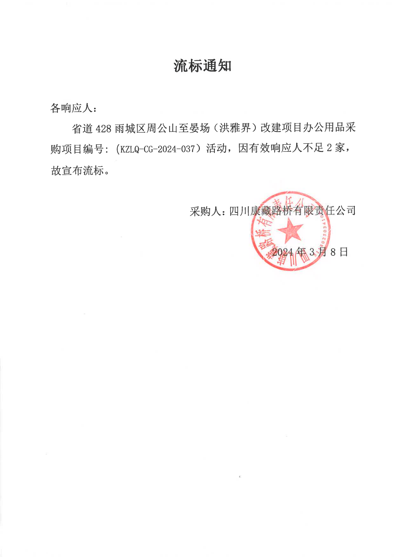 四川康藏路橋有限責(zé)任公司省道428雨城區(qū)周公山至晏場(洪雅界)改建項目辦公用品采購流標通知