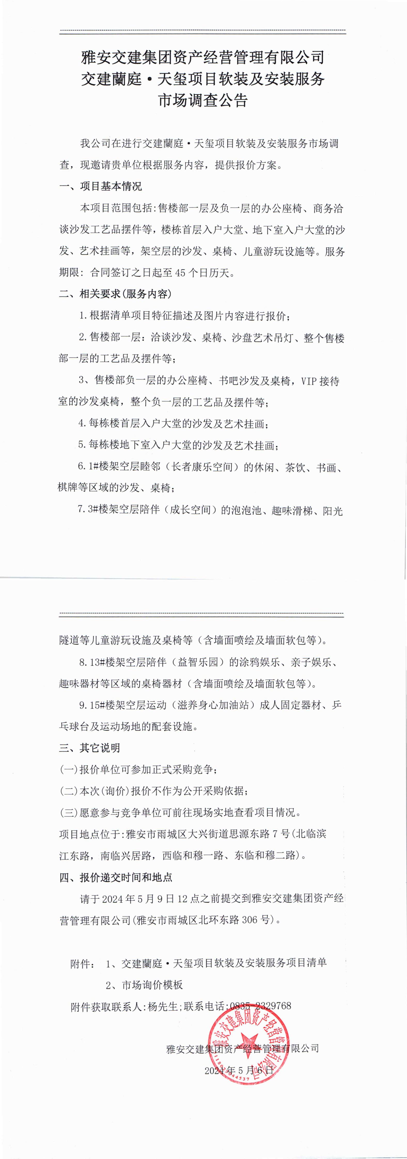 雅安交建集團資產(chǎn)經(jīng)營管理有限公司交建蘭庭·天璽項目軟裝及安裝服務市場調(diào)查公告