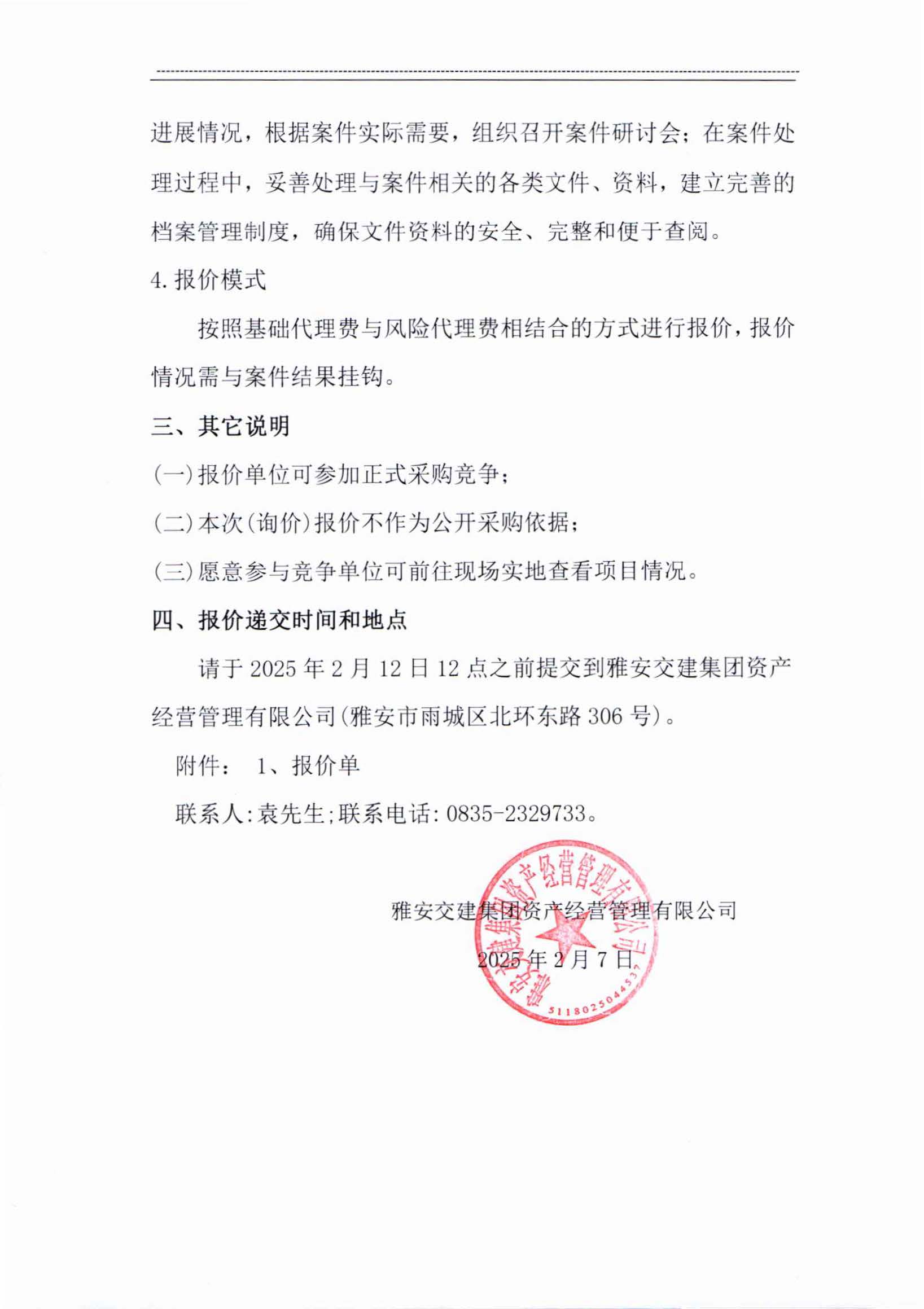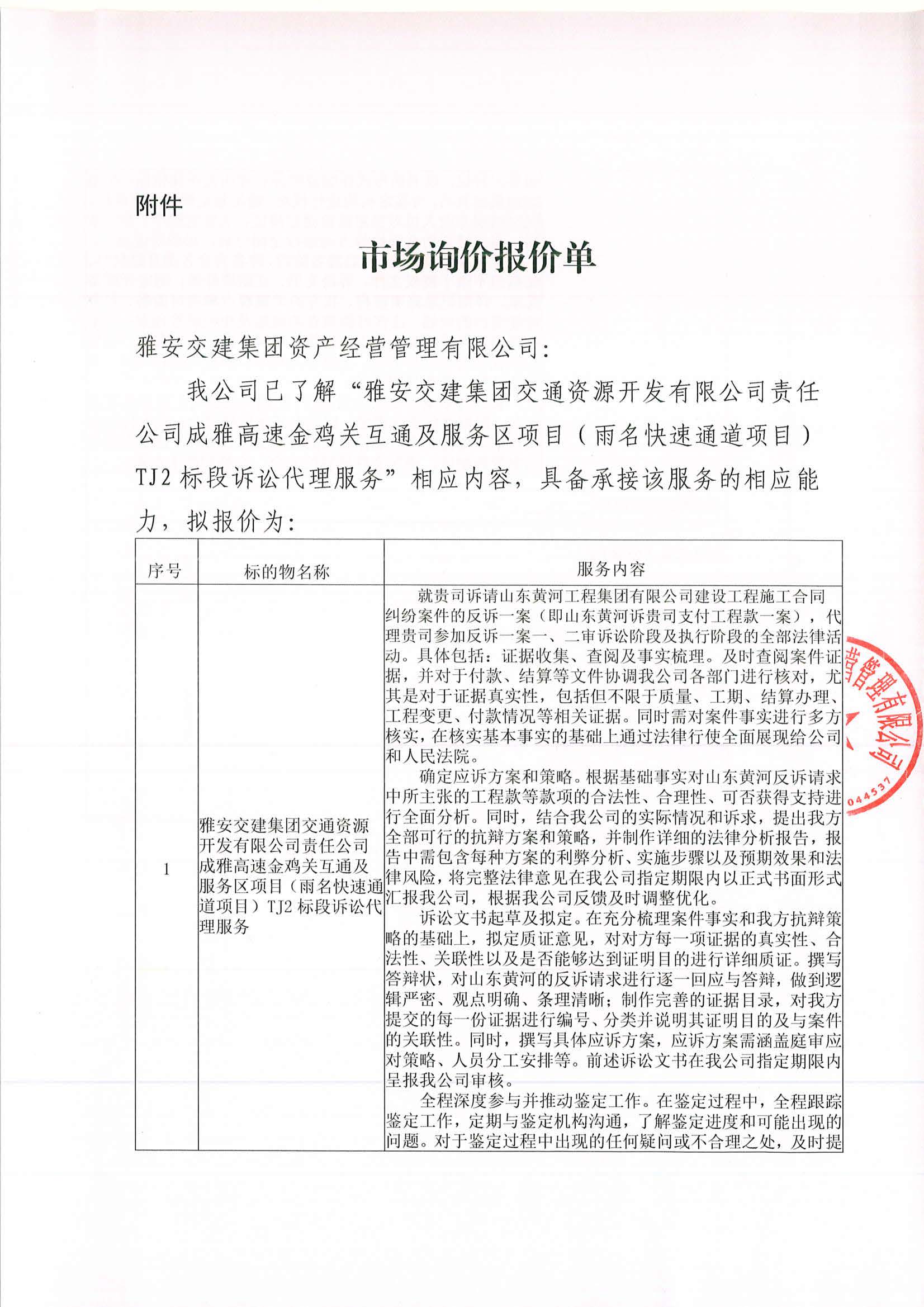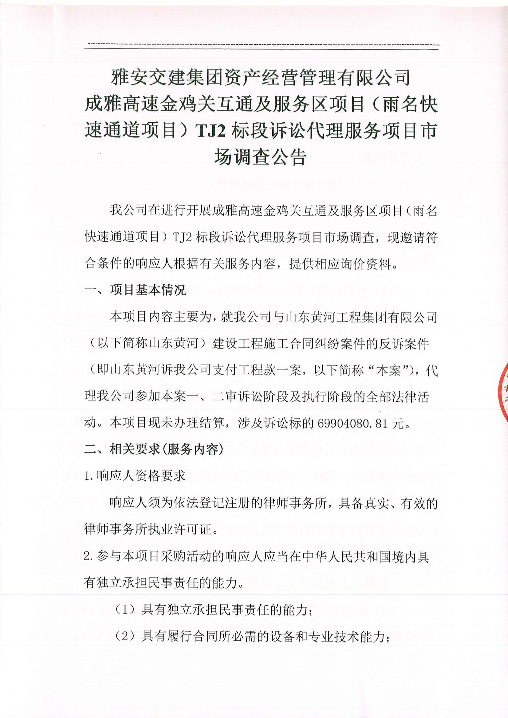 雅安交建集團資產經(jīng)營管理有限公司成雅高速金雞關互通及服務區(qū)項目(雨名快速通道項目)TJ2標段訴訟代理服務項目市場調查公告