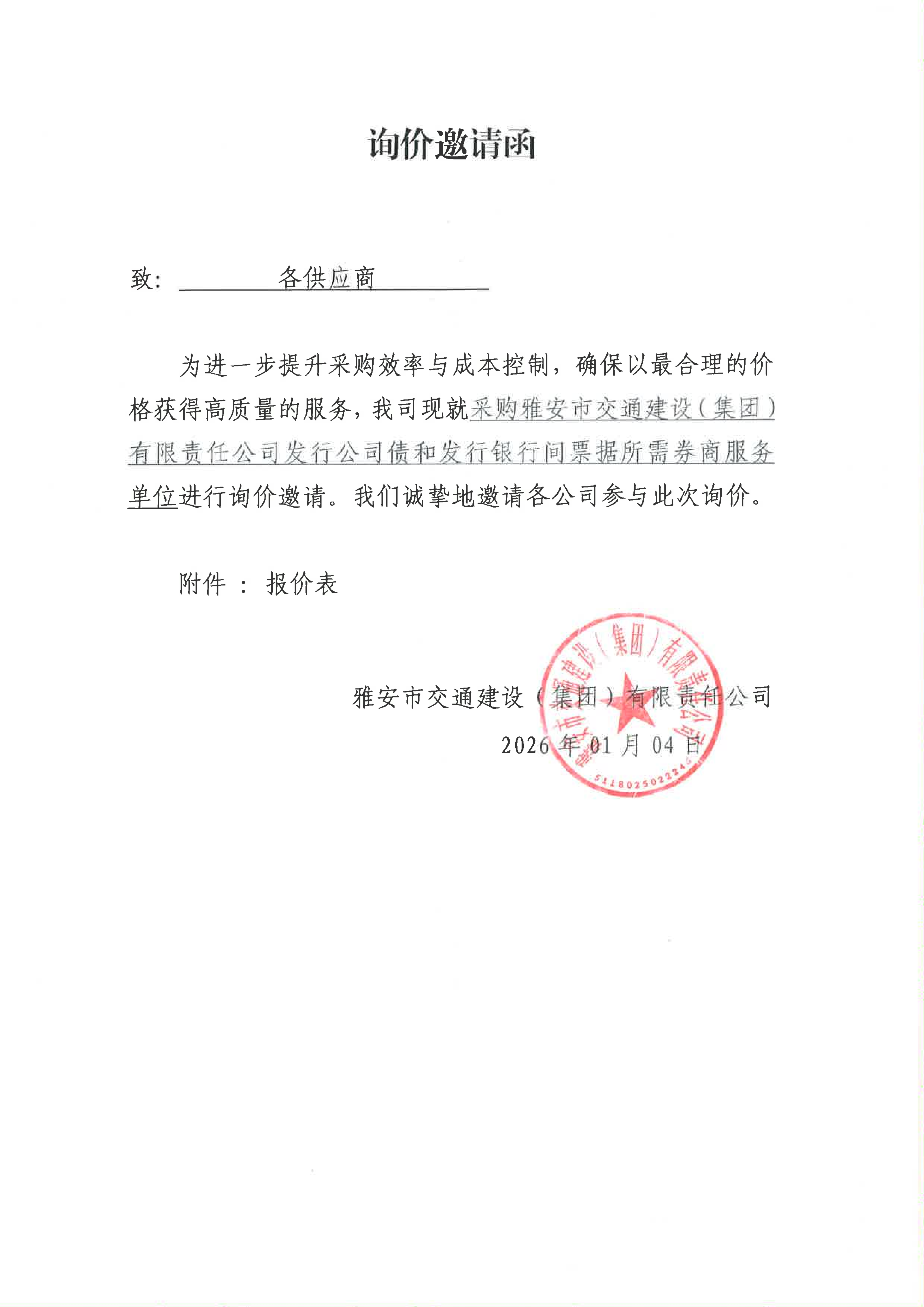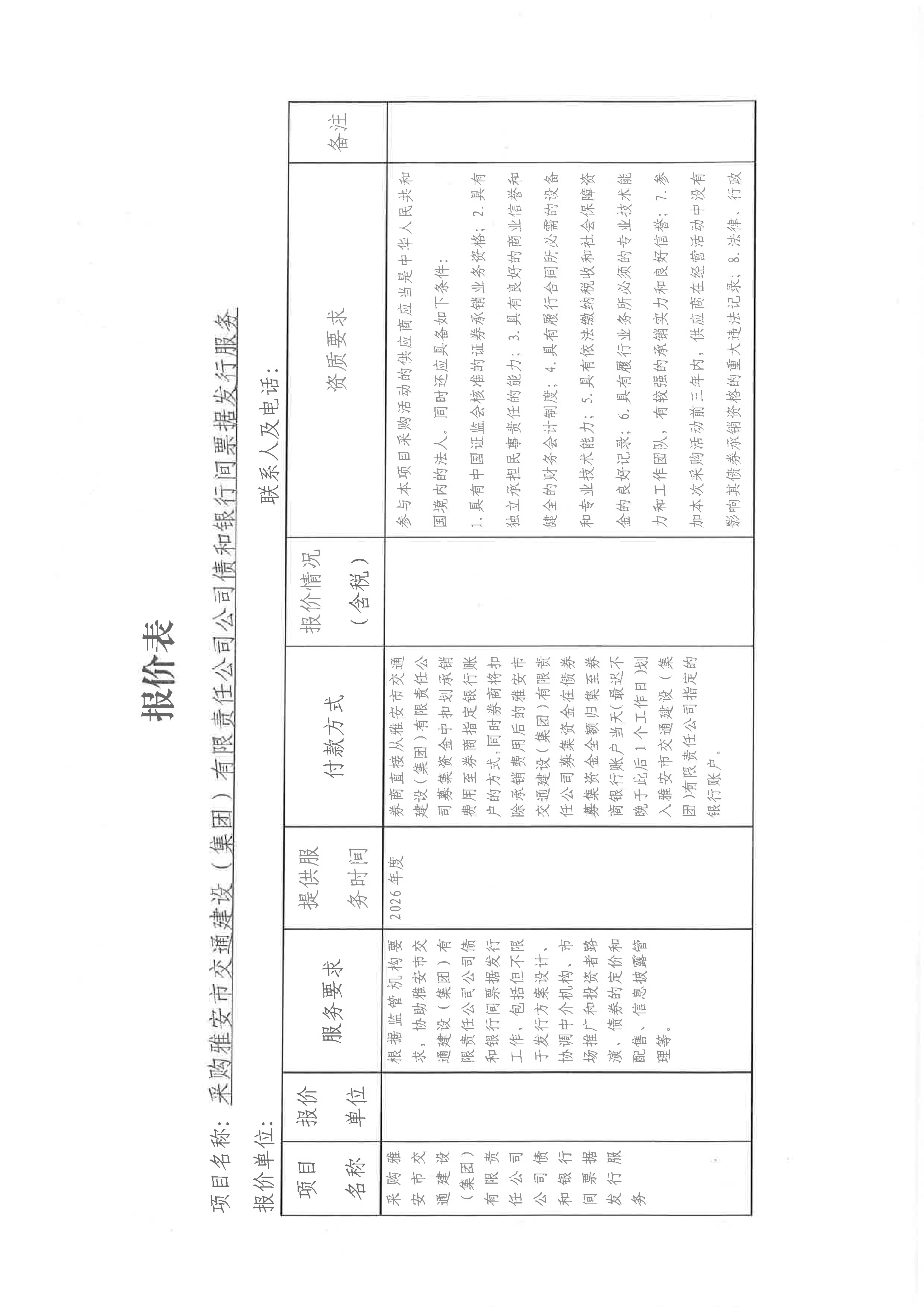 關(guān)于采購雅安市交通建設(shè)(集團)有限責(zé)任公司發(fā)行公司債和發(fā)行銀行間票據(jù)所需券商服務(wù)限價的詢價函