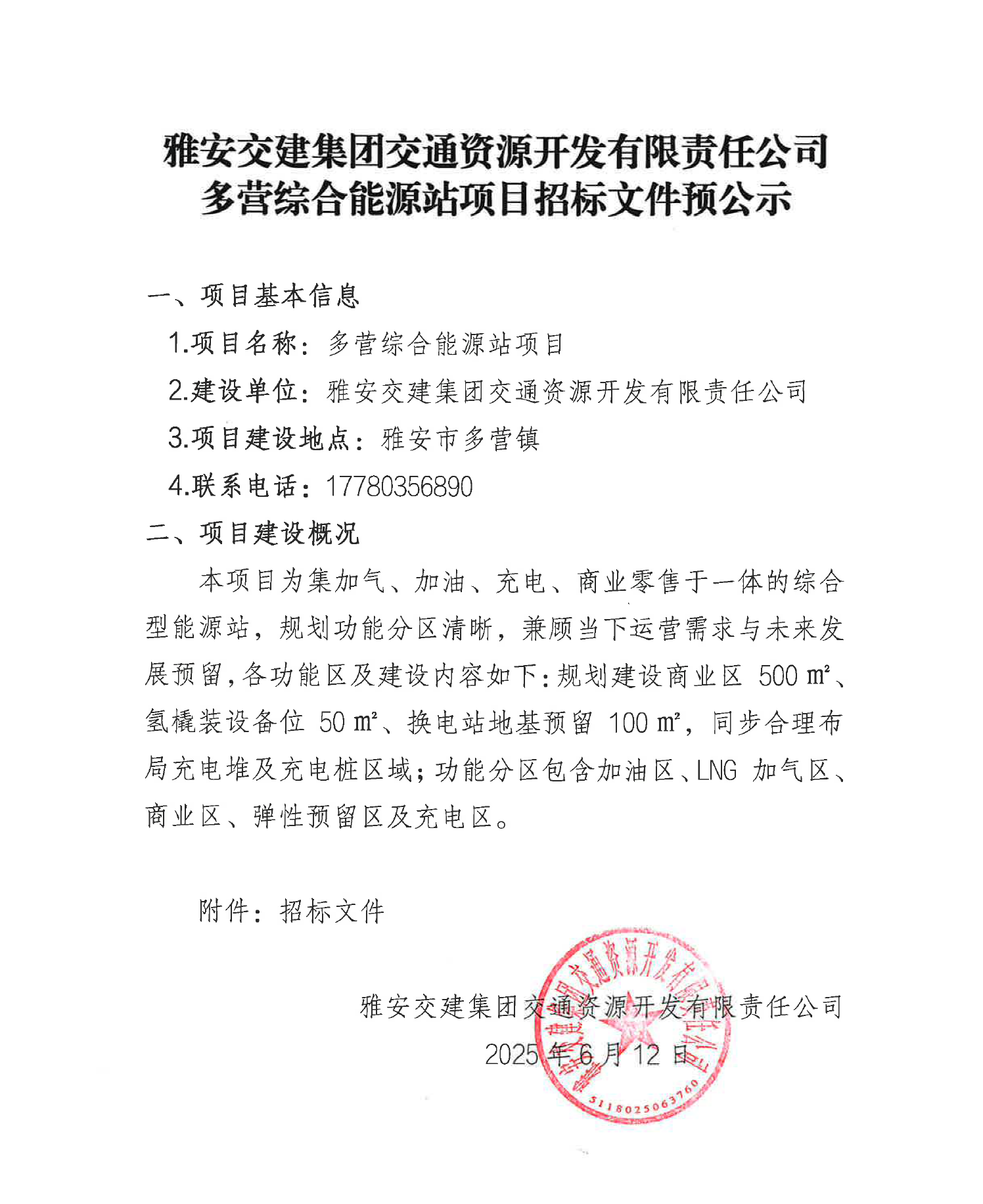 雅安交建集團(tuán)交通資源開發(fā)有限責(zé)任公司多營綜合能源站項目招標(biāo)文件預(yù)公示