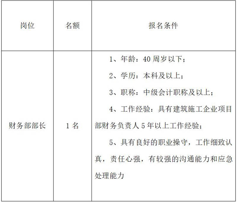 雅安交建集團路橋有限責(zé)任公司是雅安市交通建設(shè)(集團)有限責(zé)任公司下屬子公司,主要從事道路、橋梁修建。現(xiàn)根據(jù)公司業(yè)務(wù)發(fā)展需要,擬向社會公開招聘1名財務(wù)部部長,現(xiàn)將有關(guān)事項公告如下: