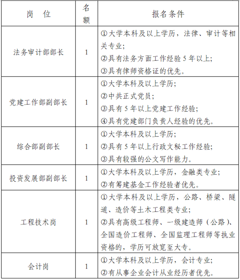 雅安市交建集團(tuán)是市屬重點國有企業(yè),主要從事交通基礎(chǔ)設(shè)施及配套服務(wù)設(shè)施的投資、建設(shè)、經(jīng)營和交通資源的開發(fā)利用等業(yè)務(wù)。根據(jù)公司發(fā)展需要,決定面向社會公開招聘6名工作人員,現(xiàn)將有關(guān)事項公告如下: