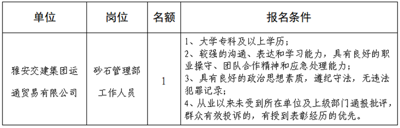 根據(jù)發(fā)展需要,決定面向社會(huì)公開(kāi)招聘雅安市交通建設(shè)(集團(tuán))有限責(zé)任公司(以下簡(jiǎn)稱“雅安交建集團(tuán)”)所屬子公司工作人員1名,現(xiàn)將有關(guān)事項(xiàng)公告如下:
