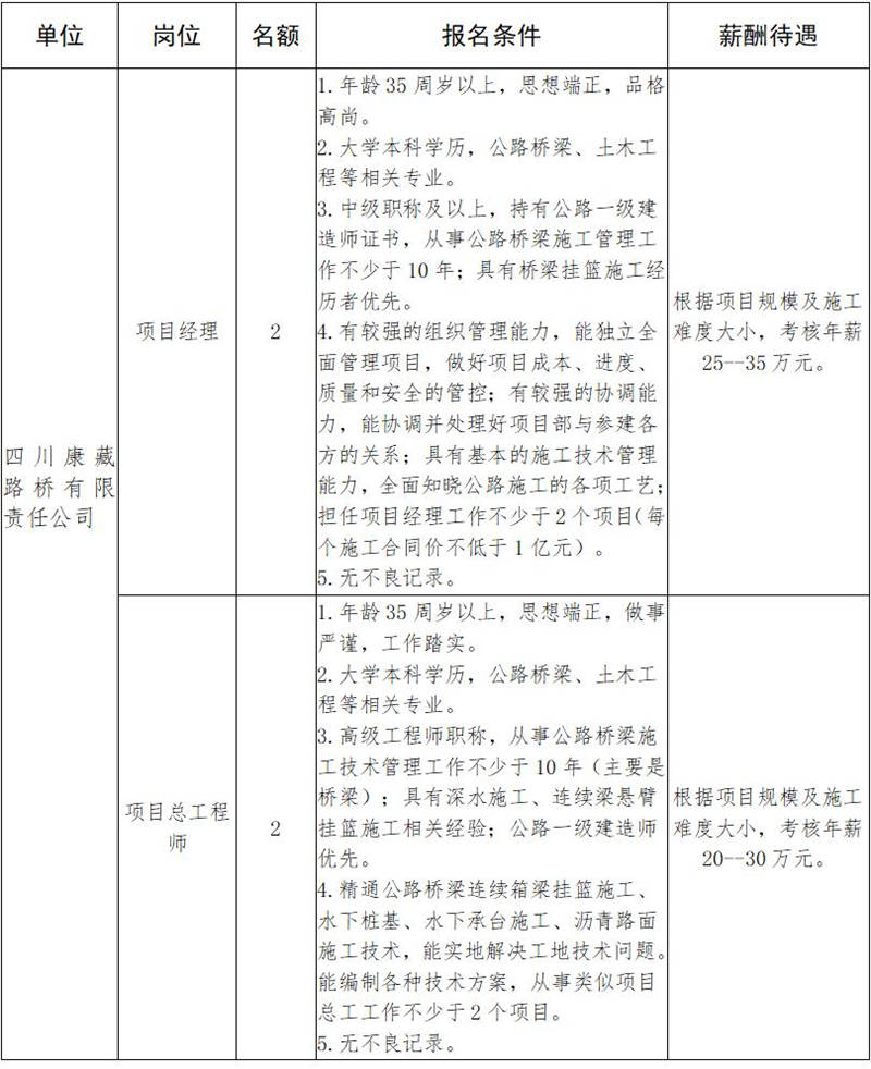 根據(jù)發(fā)展需要,決定面向社會公開招聘雅安市交通建設(shè)(集團)有限責任公司(以下簡稱“雅安交建集團”)所屬子公司工程項目主要負責人10名,現(xiàn)將有關(guān)事項公告如下: