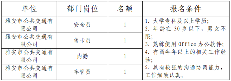 1、報名。公告發(fā)布在雅安市交通建設(集團)有限責任公司門戶網站,自發(fā)布之日起,即可報名。截止時間為2019年6月8日。網上報名,報名者須如實填寫《報名登記表》。在規(guī)定時間內將填寫好的《報名登記表》、本人有效身份證、畢業(yè)證、職稱、執(zhí)業(yè)資格及工作業(yè)績等證明材料以電子文檔的形式發(fā)送至郵箱104515026@qq.com(姓名+應聘公司名稱+應聘工作崗位)。咨詢電話15908143154。