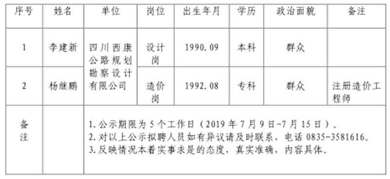 雅安交建集團子公司擬聘用人員公示(佳岳公司)