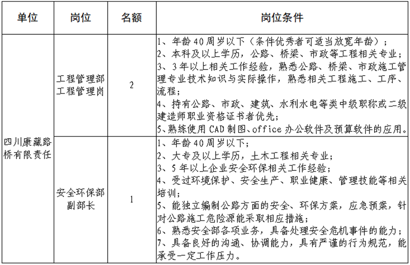 根據(jù)發(fā)展需要,決定面向社會公開招聘雅安市交通建設(shè)(集團(tuán))有限責(zé)任公司(以下簡稱“雅安交建集團(tuán)”)所屬子公司相關(guān)人員3名,現(xiàn)將有關(guān)事項公告如下: