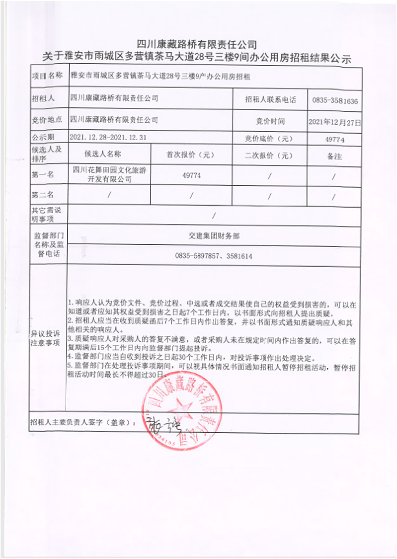 四川康藏路橋有限責任公司關于雅安市雨城區(qū)多營鎮(zhèn)茶馬大道28號三樓9間辦公用房招租結果的公示