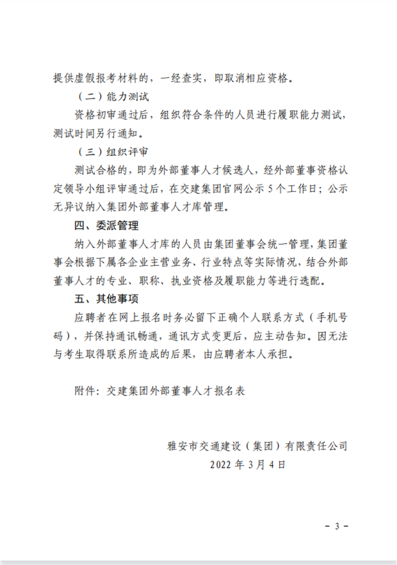 雅安交通建設(shè)(集團(tuán))有限責(zé)任公司 關(guān)于建立外部董事人才庫的公告