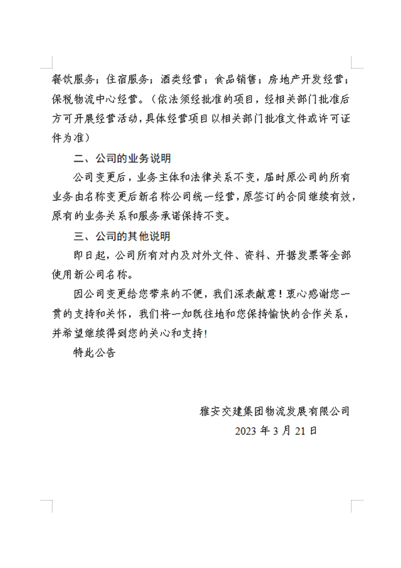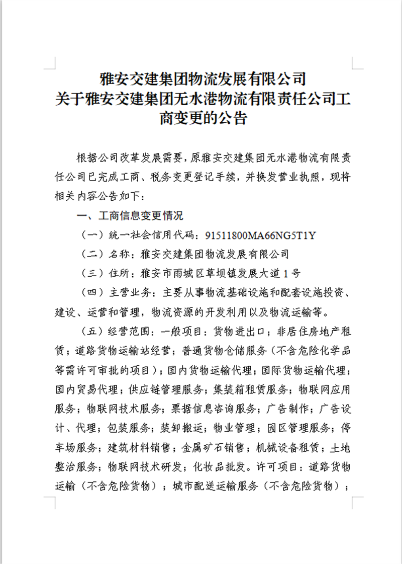雅安交建集團物流發(fā)展有限公司關(guān)于雅安交建集團無水港物流有限責任公司工商變更的公告