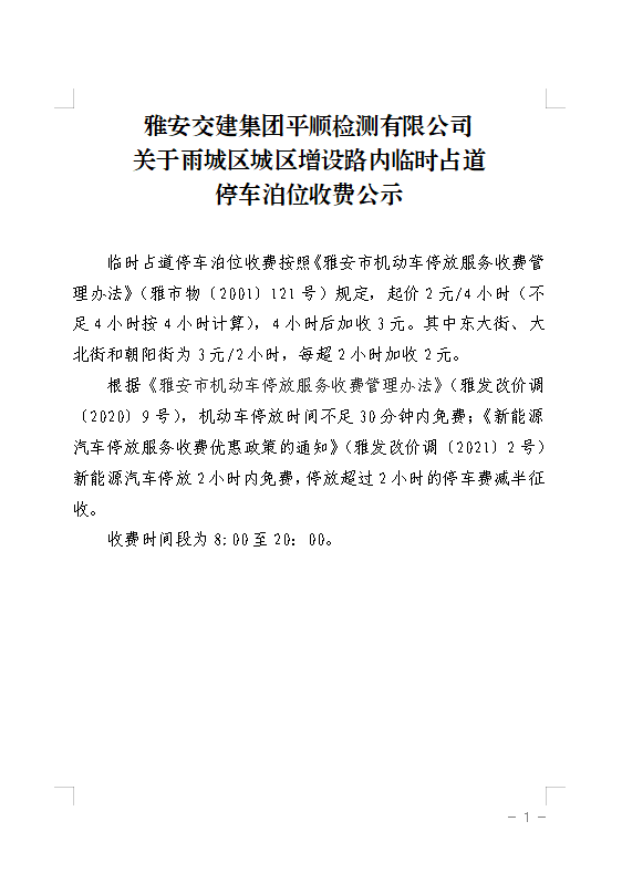 雅安交建集團(tuán)平順檢測有限公司 關(guān)于雨城區(qū)城區(qū)增設(shè)路內(nèi)臨時占道 停車泊位收費(fèi)公示附件