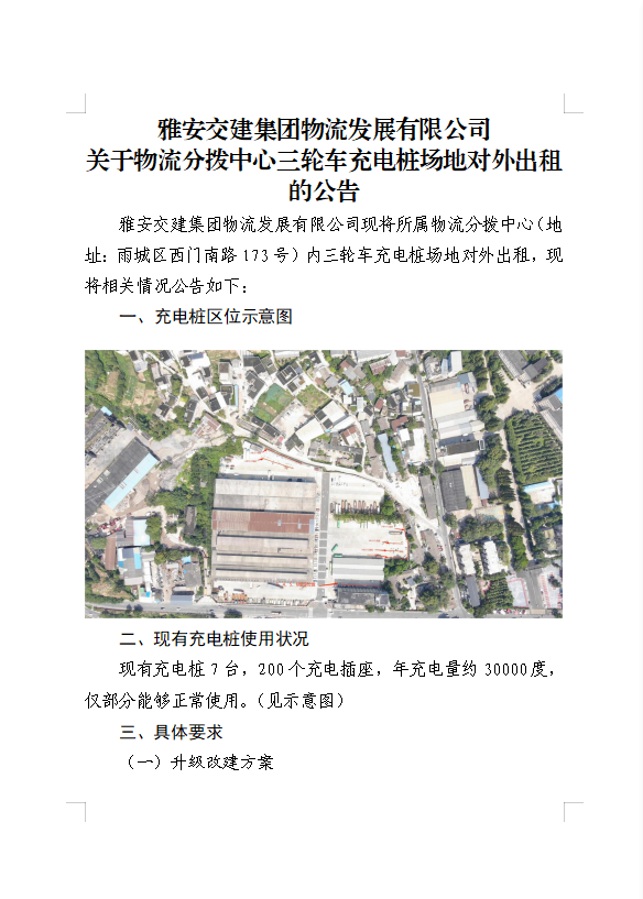 雅安交建集團物流發(fā)展有限公司關(guān)于物流分撥中心三輪車充電樁場地對外出租的公告