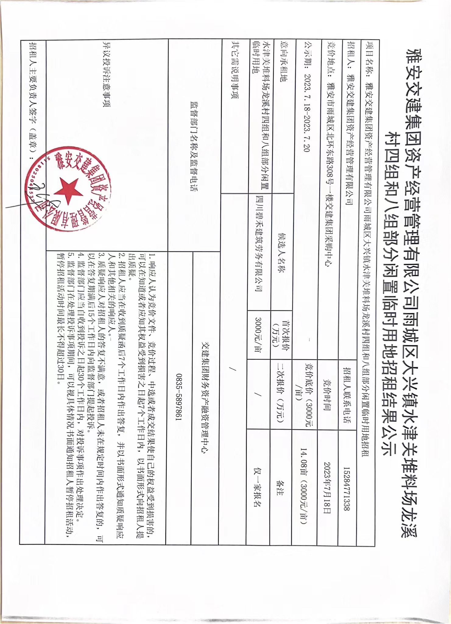 雅安交建集團(tuán)資產(chǎn)經(jīng)營(yíng)管理有限公司雨城區(qū)大興鎮(zhèn)水津關(guān)堆料場(chǎng)龍溪村四組和八組部分閑置臨時(shí)用地招租結(jié)果的公示