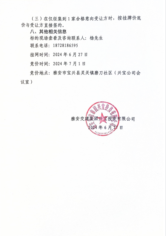 雅安交建集團興寶投資有限公司寶興縣靈關鎮(zhèn)代碑寺土地整理項目10萬噸可利用棄渣競價銷售公告(2024.6.21)