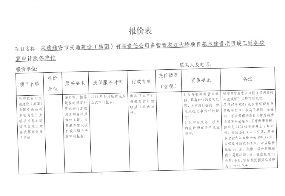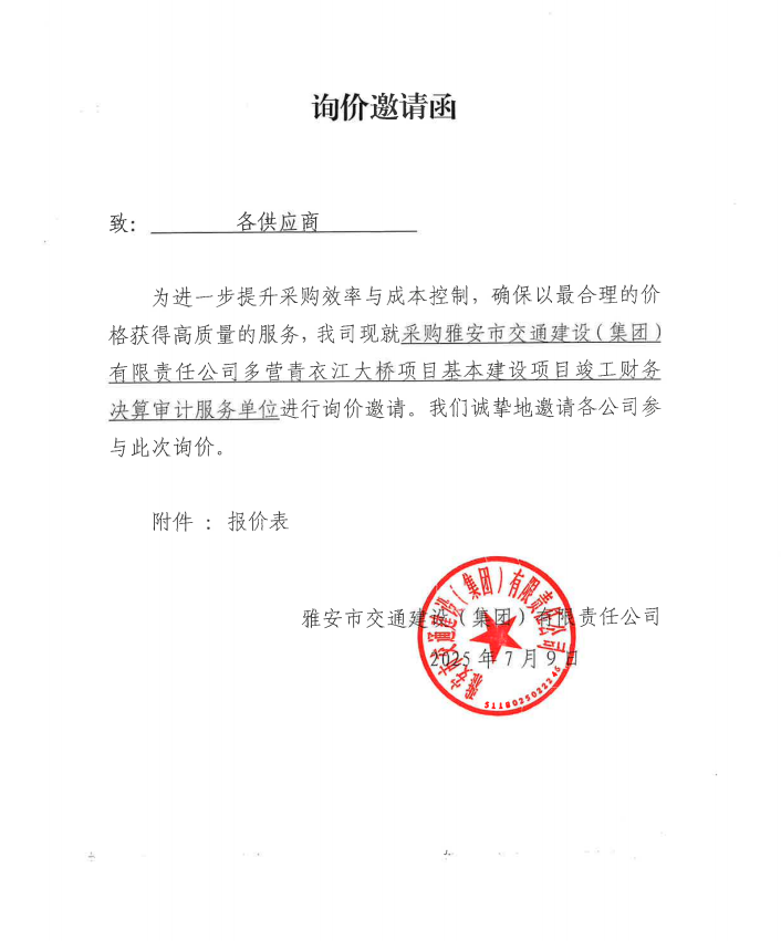 詢價邀請函——采購雅安市交通建設(集團)有限責任公司多營青衣江大橋項目基本建設項目竣工財務決算審計服務單位
