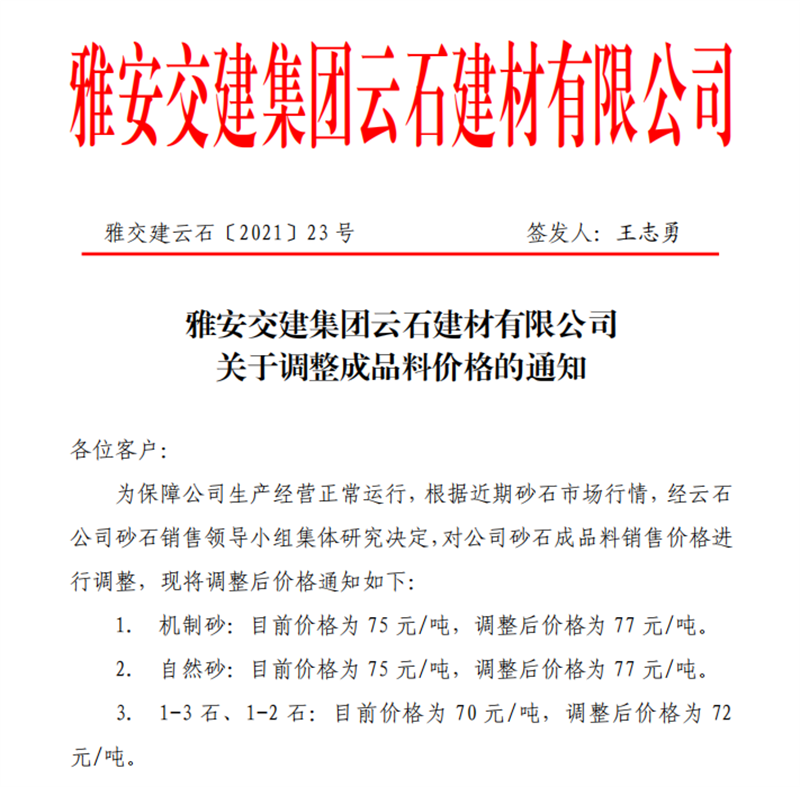 雅安交建集團(tuán)云石公司砂石骨料銷售價(jià)格情況表(2021.5.3)