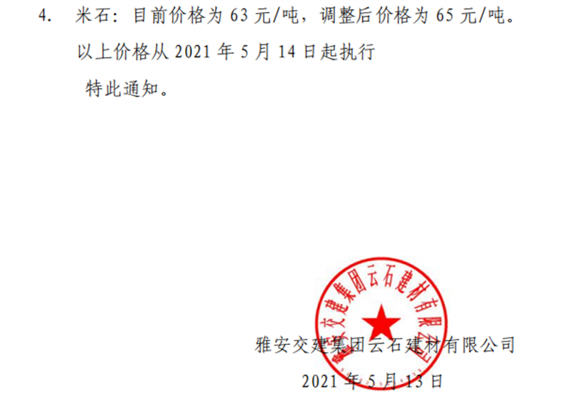 雅安交建集團(tuán)云石公司砂石骨料銷售價(jià)格情況表(2021.5.14)