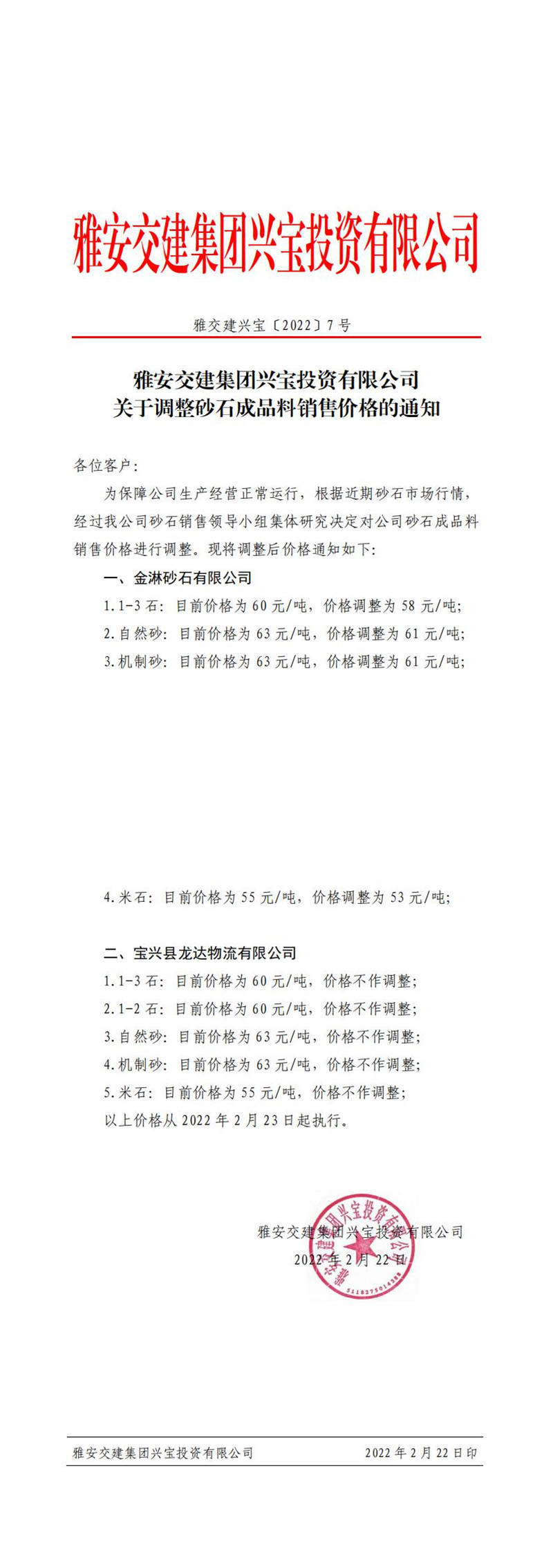 雅安交建集團(tuán)興寶投資有限公司 關(guān)于調(diào)整砂石成品料銷(xiāo)售價(jià)格的通知(2022-2-23)