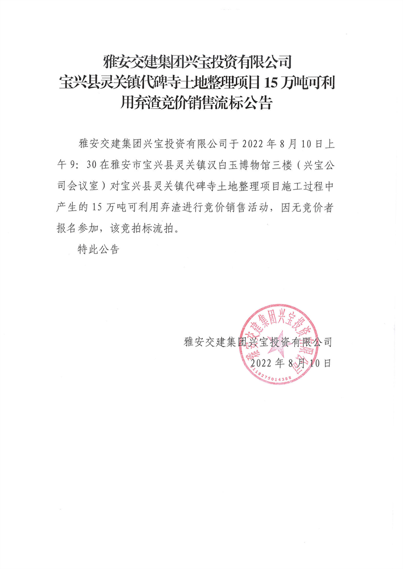 雅安交建集團(tuán)興寶投資有限公司靈關(guān)鎮(zhèn)代碑寺土地整理項(xiàng)目15萬(wàn)噸可利用棄渣競(jìng)價(jià)銷售流標(biāo)公告